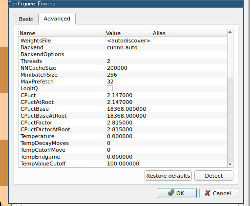 | CPuctBase | –cpuct-base | 38739.00 | cpuct_base constant from “UCT search” algorithm. Lower value means higher growth of Cpuct as number of node visits grows. |